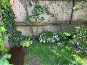 Ungefähr zu dieser Zeit habe ich mit meiner Familie den Garten übernommen. Zuerst wurden 3 der 4 Bäume gefällt, als Ersatzpflanzungen kamen, wie vorgeschrieben, je eine Hainbuche. Und ich habe eine Terrasse gebaut, damals ungefähr halb so groß wie jetzt. Seit damals habe ich vieles gepflanzt, das wieder verschwunden ist, zwei Forsythien zum Beispiel, die werden einfach zu groß für diesen Mini-Garten.