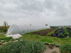 Geplant war, dass wir dann zu Fuß zum „GRAND GARTEN“ hinüber gehen. Das ist der Teil der GRAND FARM, der Market Gardening betreibt, siehe grandfarm.at/grand-garten-home. Man konnte den Folientunnel und die Container vom Hof aus sehen, aber bei DEM Wetter sind wir doch lieber mit den Autos gefahren.