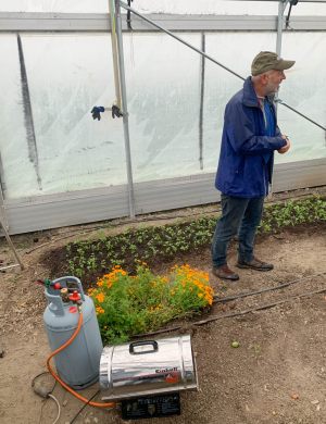 Zuerst wurden uns, noch im Freien, einige Gemüsebeete und das Gemüsekisterl-Abo erklärt, dann ging’s für weitere Diskussionen und Fragen in einen großen Folientunnel, wo der Gastgeber netter Weise eine kleine Heizkanone aufgestellt hat. Mittlerweile waren viele Teilnehmer*innen doch ein wenig durchgefroren.